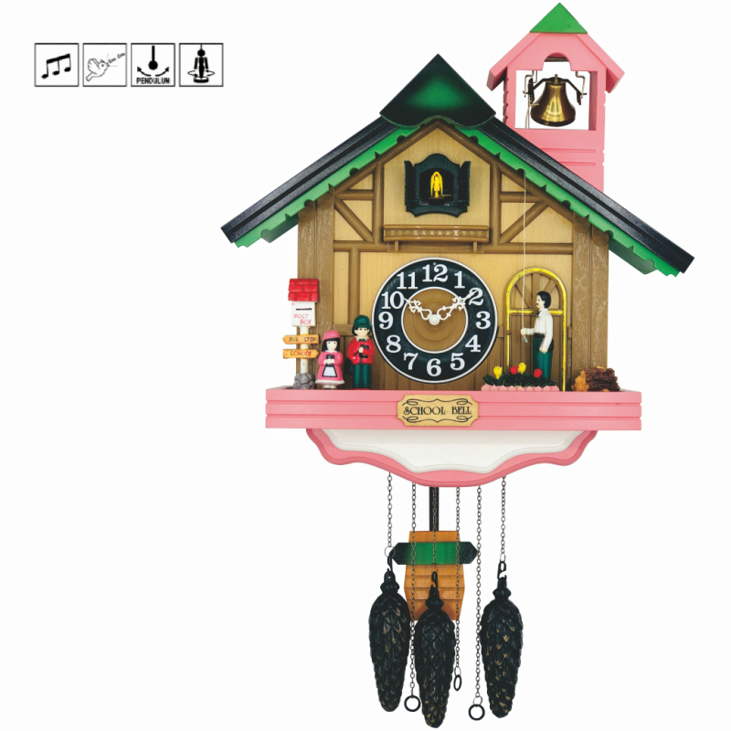 Wooden quartz cuckoo clock: this clock is made of plywood. The dial and the hands are also wood, and the two big trees are hand engraved. It also has nice decorations, such as the figures, the dog , the grass.