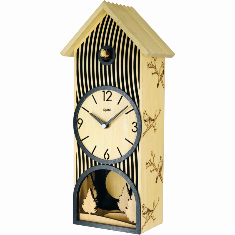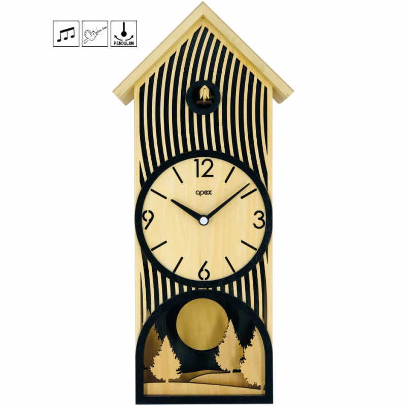 Modern design wooden quartz cuckoo clock with pendulum: this clock is made of plywood and solid wood. Large black Arabic numerals for clear reading and the time is clear at a glance.